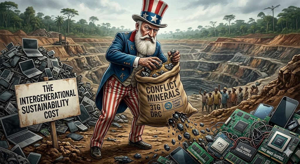 The trajectory of modern consumer electronics remains heavily in line with a traditional linear supply chain, inspired by classical capitalism: a model built on the flawed economic assumption that the extraction of virgin materials is both infinite and inherently more profitable than closed-loop recycling. For decades, this has been economically validated, and it remains demonstrably cheaper for manufacturers to use newly mined tantalum or gold from the DRC, similar to an “Uncle Sam”-attired King Leopold II, than to navigate the unexplored and underfunded logistical complexities and high capital costs of reverse logistics.