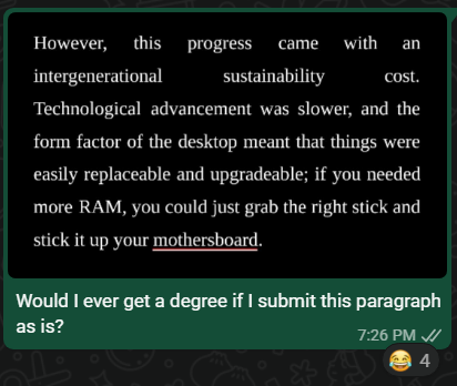 However, this progress came with an intergenerational sustainability cost. Before, technological advancement was slower, and the desktop’s form factor made components easily replaceable and upgradeable. This resulted in a twofold effect. Fewer frequent upgrades were needed, and such upgrades or repairs were modular, focusing on specific parts within the same form factor, replacing one component with another of the same type. It was a much more sustainable system.